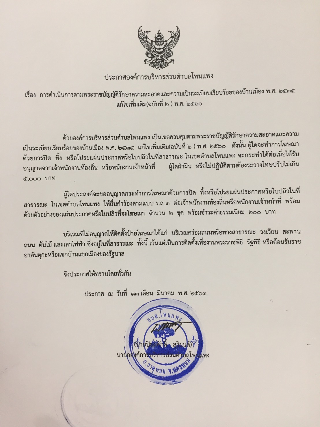 ประกาศการดำเนินการตามพระราชบัญญัติรักษาความสะอาดและความเป็นระเบียบเรียบร้อยของบ้านเมือง พ.ศ. ๒๕๓๕ (แก้ไขเพิ่มเติมฉบับที่ ๒) พ.ศ. ๒๕๖๐