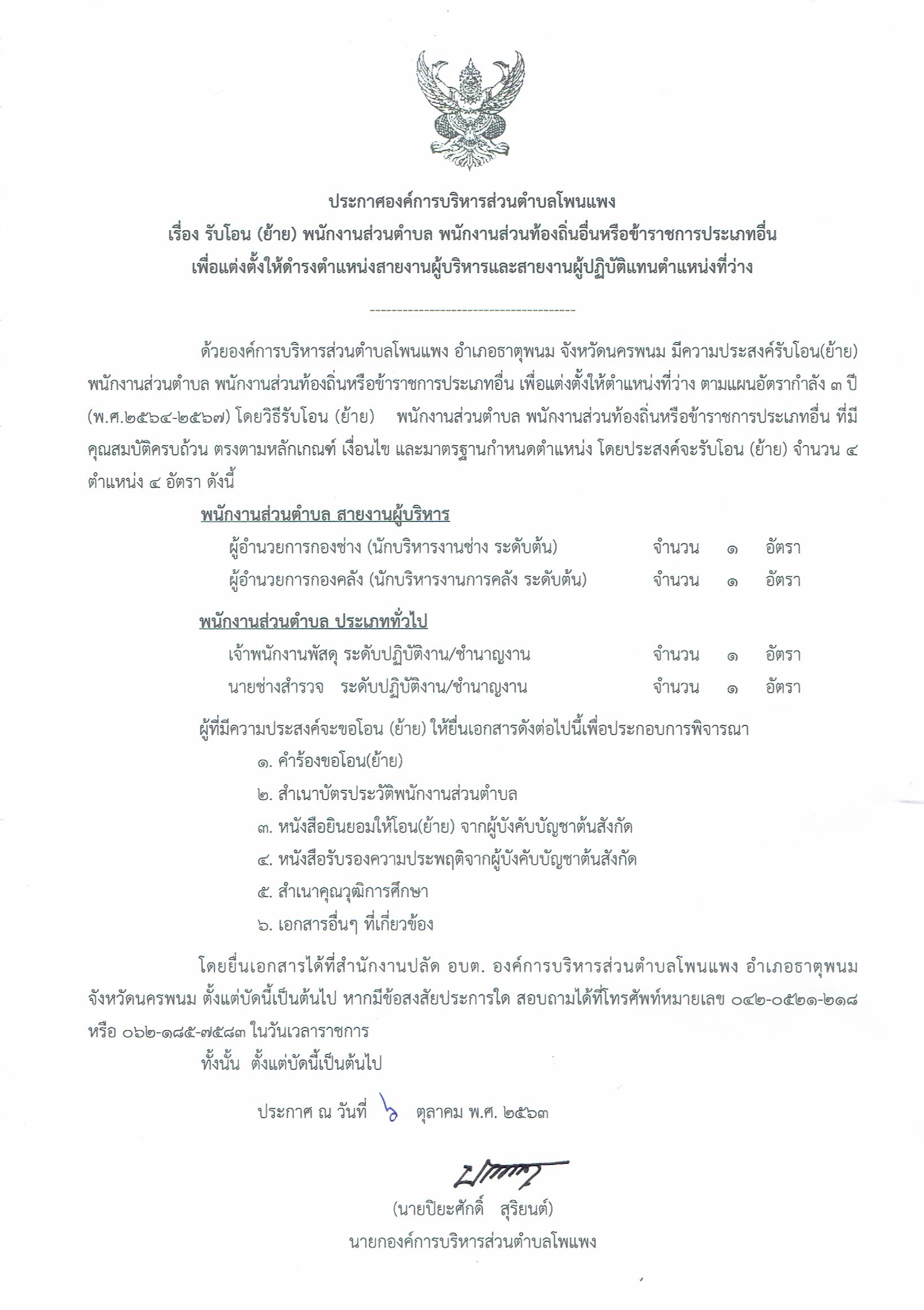 ประกาศ รับโอน (ย้าย) พนักงานส่วนตำบล พนักงานส่วนราชการท้องถิ่นหรือข้าราชการประเภทอื่น เพื่อให้ดำรงตำแหน่งสายงานผู้บริหารและสายงานผู้ปฏิบัติแทนตำแหน่งท