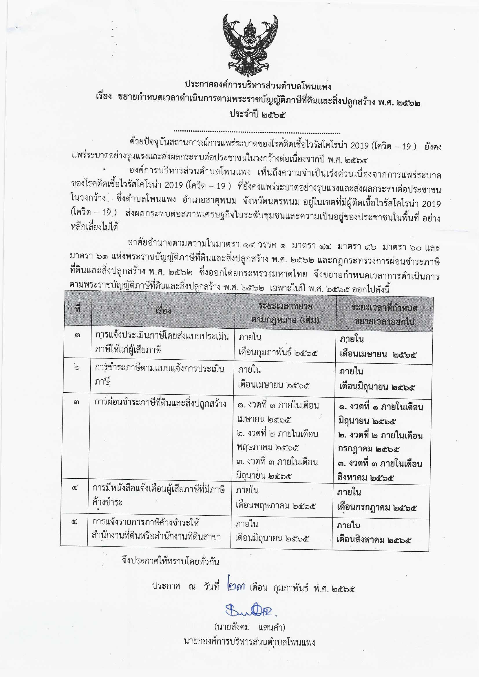 ประกาศขยายกำหนดเวลาดำเนินการตามพระราชบัญญัติภาษีที่ดินและสิ่งปลูกสร้าง พ.ศ. 2562 ประจำปี 2565