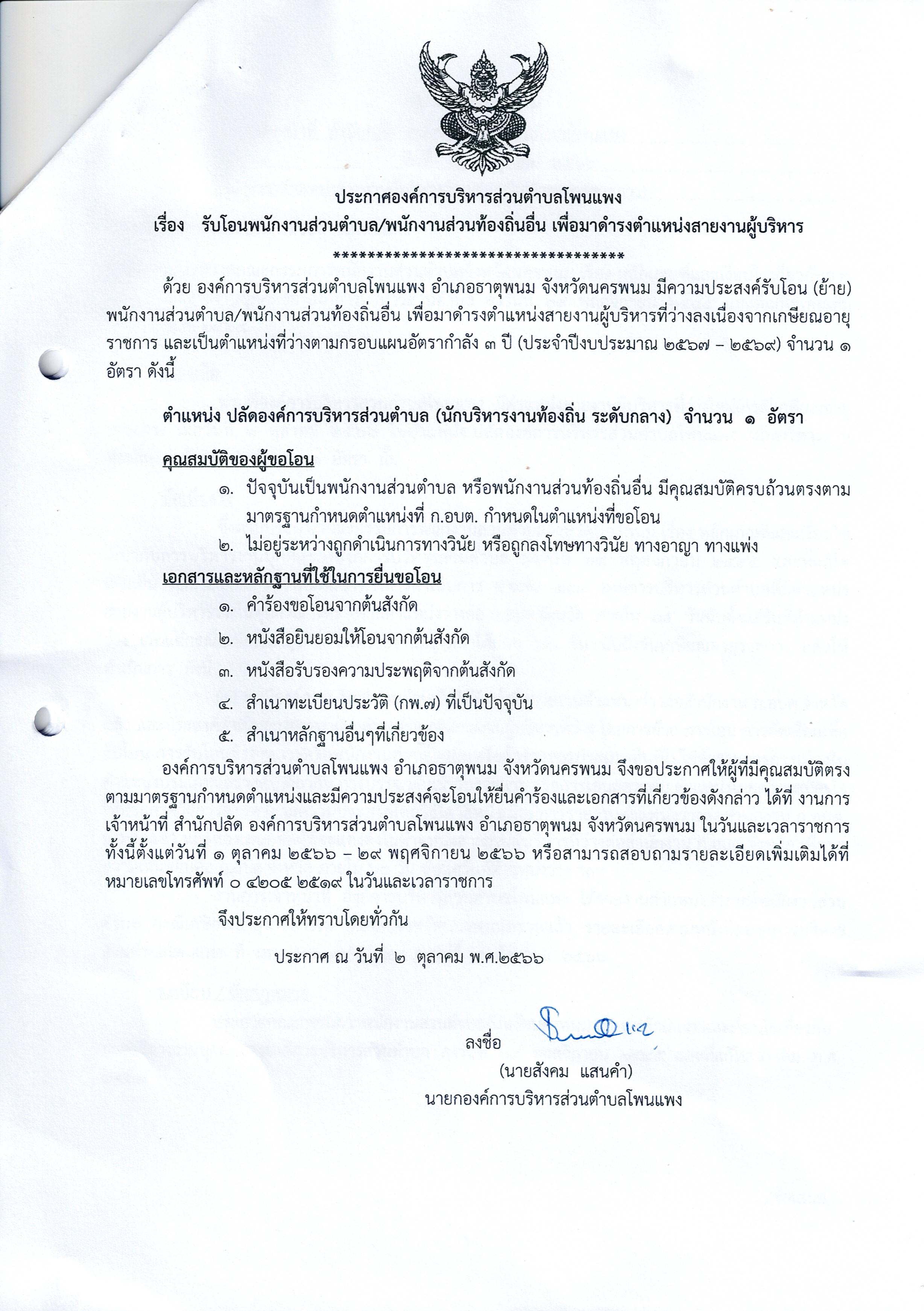 ประกาศรับโอนพนักงานส่วนตำบล พนักงานส่วนท้องถิ่นอื่น เพื่อมาดำรงตำแหน่งสายงานผู้บริหาร
