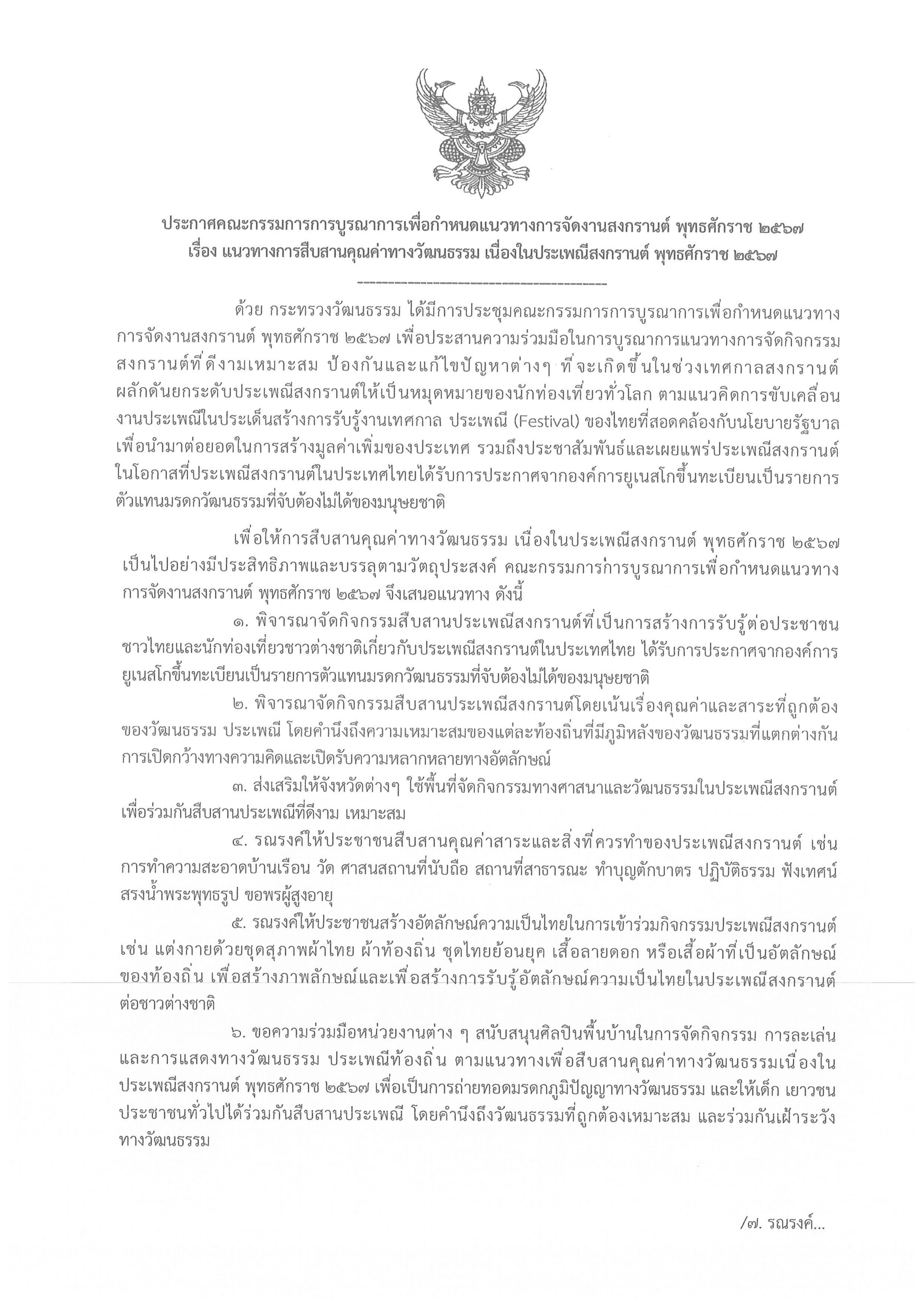 ประชาสัมพันธ์ ประกาศคณะกรรมการบูรณาการเพื่อกำหนดแนวทางจัดงานสงกรานต์ พุทธศักราช 2567 เรื่อง แนวทางสืบสานคุณค่าทางวัฒนธรรม เนื่องในประเพณีสงกรานต์ พุทธ