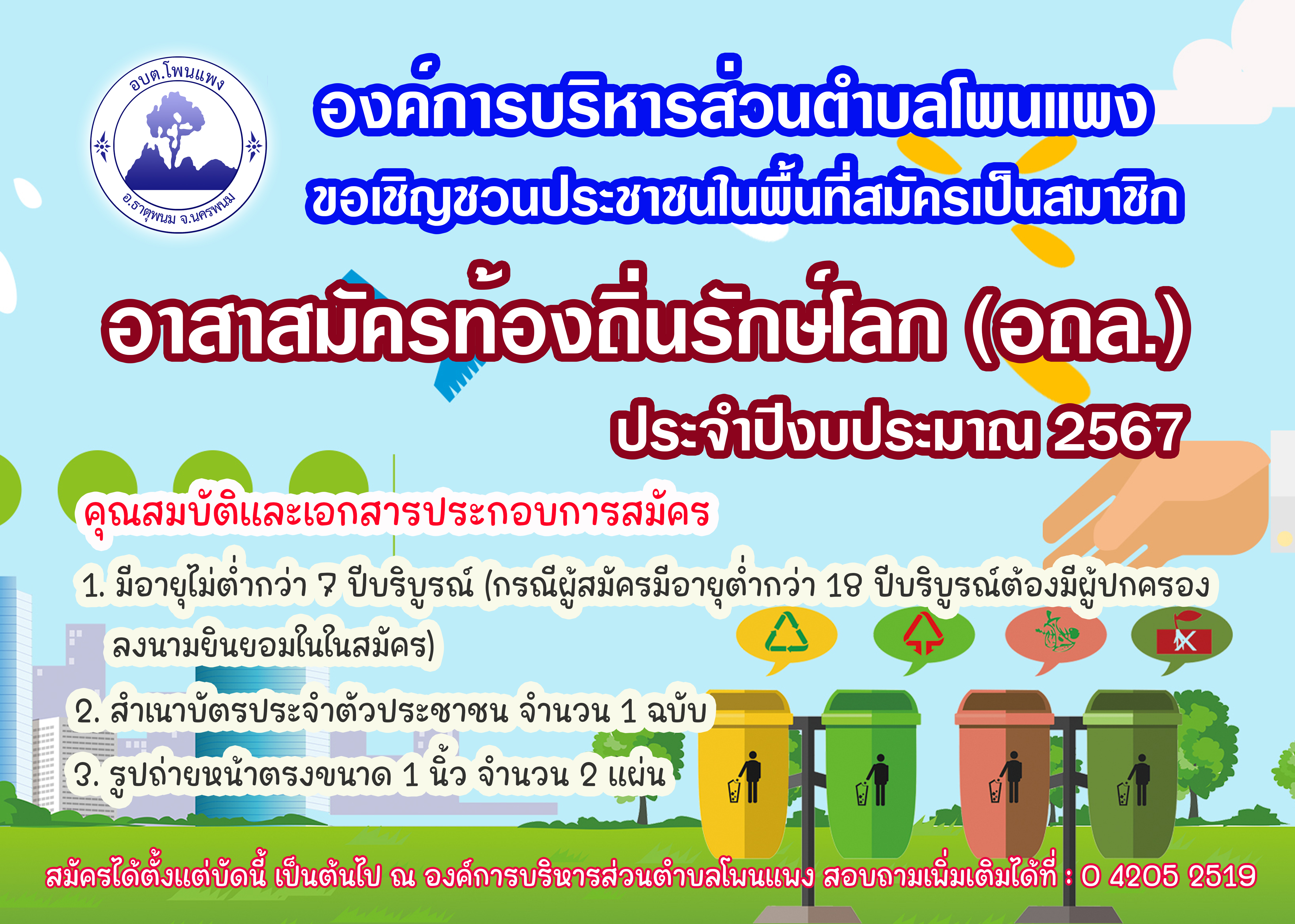 ประชาสัมพันธ์ เชิญชวนประชาชนสมัครเป็นอาสาสมัครท้องถิ่นรักษ์โลก (อถล.) ประจำปีงบประมาณ 2567
