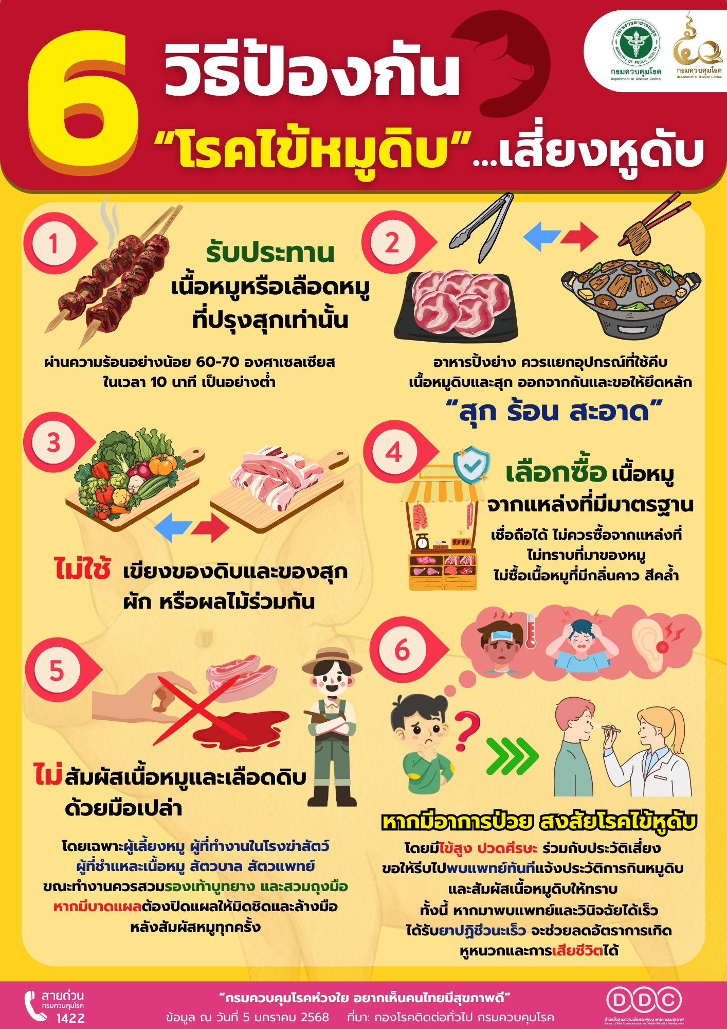 - ไม่ทานหมูสุก ๆ ดิบ ๆ หมูป่วย หรือหมูตายจากโรค