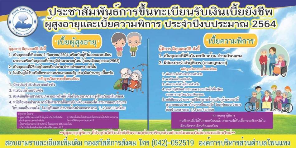 ขอความอนุเคาระห์การลงทะเบียนเป็นผู้มัสิทธิ์รับเบี้ยยังชีพผู้สูงอายุและผู้พิการประจำปี2564
