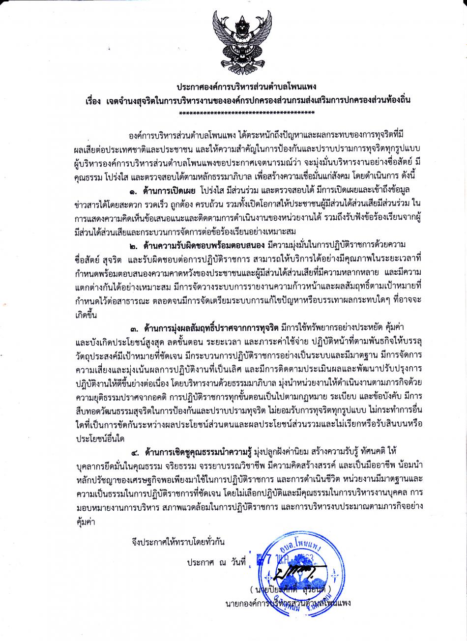 ประกาศองค์การบริหารส่วนตำบลโพนแพง เรื่อง เจตจำนงในการบริหารงานขององค์กรปกครองส่วนท้องถิ่น
