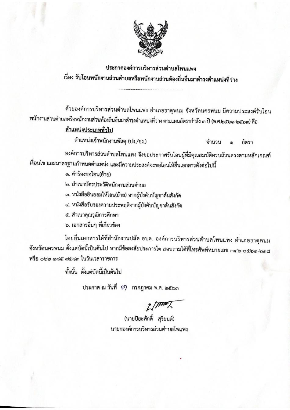 ประกาศองค์การบริหารส่วนตำบลโพนแพง เรื่อง รับโอนพนักงานส่วนตำบลหรือพนักงานส่วนท้องถิ่นอื่นมาดำรงตำแหน่งที่ว่าง