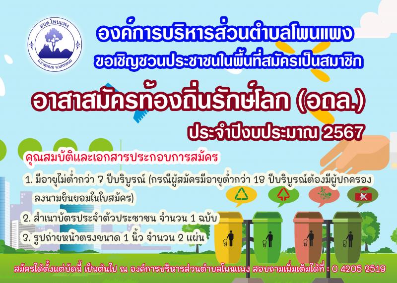ประชาสัมพันธ์ เชิญชวนประชาชนสมัครเป็นอาสาสมัครท้องถิ่นรักษ์โลก (อถล.) ประจำปีงบประมาณ 2567 [20 ธันวาคม 2566]